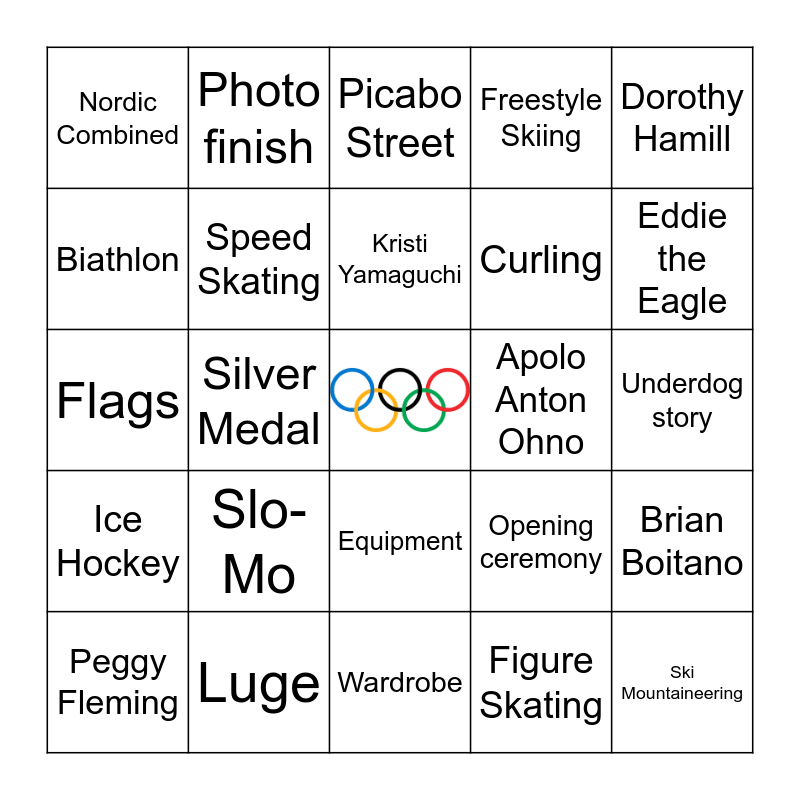 This bingo card has a free space and 59 words: Bobsled, Luge, Skeleton, Ice Hockey, Figure Skating, Ice Dancing, Speed Skating, Short Track Speed Skating, Curling, Alpine Skiing, Freestyle Skiing, Snowboarding, Biathlon, Cross-Country Skiing, Ski Jumping, Nordic Combined, Ski Mountaineering, Dorothy Hamill, Shaun White, Kristi Yamaguchi, Apolo Anton Ohno, Picabo Street, Peggy Fleming, Brian Boitano, Lindsey Vonn, 1980 US Men's Hockey Team, Tonya Harding, Nancy Kerrigan, Eddie the Eagle, 1988 Jamaican Bobsled Team, Michelle Kwan, Johnny Weir, Adam Rippon, Tara Lipinksi, Photo finish, Medal ceremony, Gold Medal, Silver Medal, Bronze Medal, Flags, Replay, Slo-Mo, Underdog story, GOAT, Snow, Ice, Altitude, Weather, Equipment, Wardrobe, Accomodations, Perfect 10, Dramatic comeback, Mountains, Torch, Opening ceremony, TV Broadcast, Commentator and Judges.