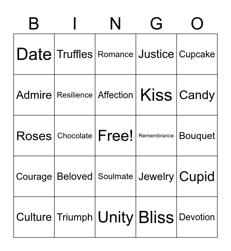 This bingo card has a free space and 42 words: Adoration, Affection, Amour, Beloved, Bliss, Cupid, Devotion, Heartthrob, Romance, Soulmate, Bouquet, Candy, Chocolate, Cupcake, Flowers, Jewelry, Perfume, Roses, Teddy Bear, Truffles, Admire, Card, Candlelight, Date, Dinner, Hug, Kiss, Letter, Valentine, Black History Month, Unity, Courage, Resilience, Unity, Excellence, Culture, Triumph, Remembrance, Heritage, Equality, Justice and Activism.