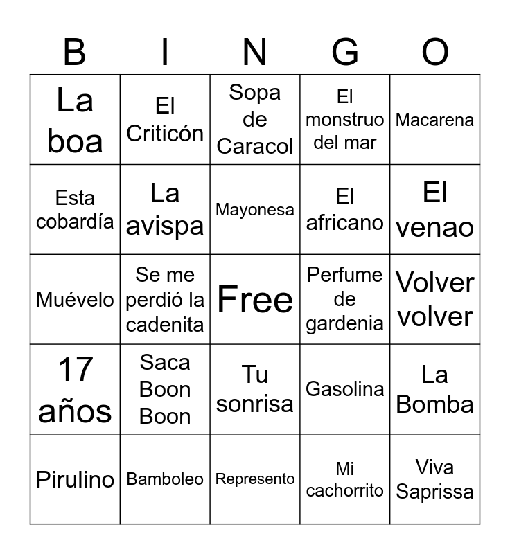 This bingo card has a free space and 51 words: Ninguno pudo con él, Viva Saprissa, Corazón manudo, Represento, Saca Boon Boon, Julieta ta, El Criticón, Puerto Limón, Esta cobardía, Los pollitos, La avispa, El monstruo del mar, La Bomba, Gasolina, La bilirrubina, La vida es un carnaval, Mayonesa, Perfume de gardenia, Mireya, Macarena, Se me perdió la cadenita, Mi cachorrito, La boa, El africano, La camisa negra, Querida, El venao, Abusadora, Pirulino, Sopa de Caracol, Jugo de piña, Todos me miran, Torero, Conga, Despacito, Bamboleo, Billie Jean, Piel canela, Limón limonero, El Rey, Volver volver, 17 años, 123, Levantando las manos, Mi cucu, El colesterol, Muévelo, Mambo No.5, Mujeres, Tu sonrisa and La suavecita.