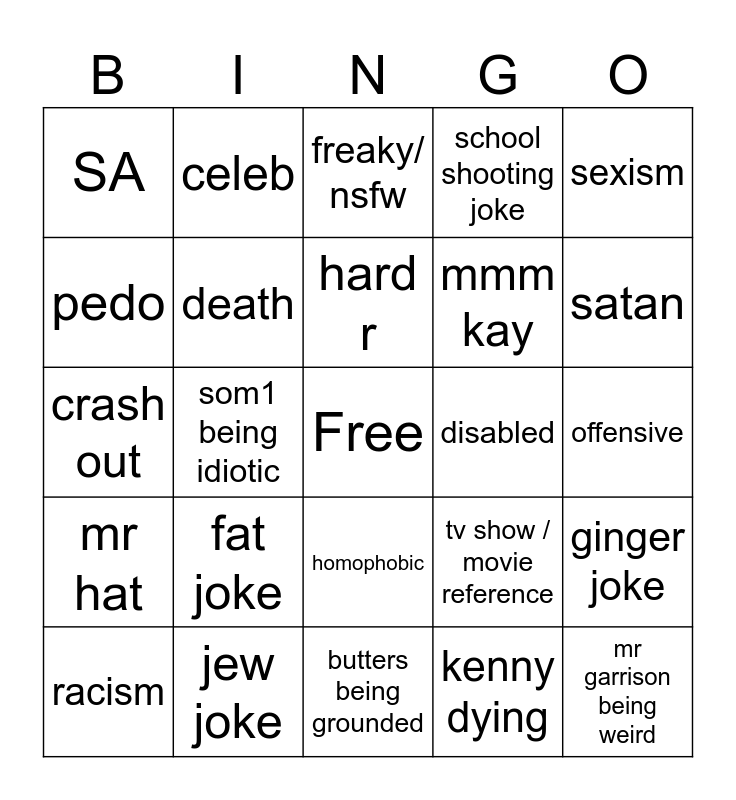 This bingo card has a free space and 24 words: fat joke, jew joke, hard r, racism, sexism, SA, pedo, celeb, disabled, homophobic, mmm kay, crash out, tv show / movie reference, ginger joke, death, kenny dying, offensive, freaky/ nsfw, satan, som1 being idiotic, mr garrison being weird, mr hat, school shooting joke and butters being grounded.
