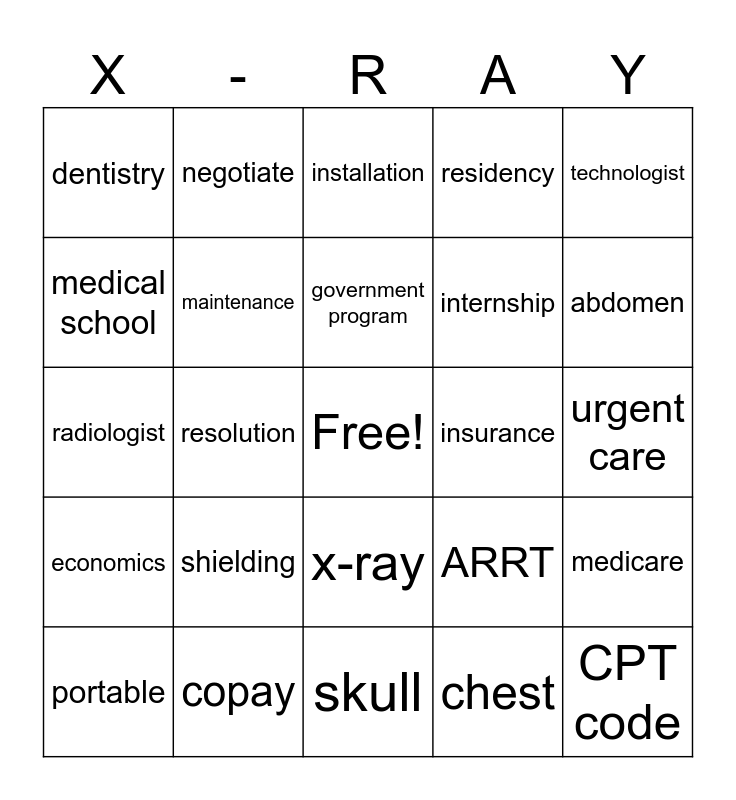This bingo card has a free space and 29 words: portable, stationary, resolution, software, dentistry, installation, maintenance, shielding, insurance, copay, urgent care, CPT code, skull, chest, abdomen, spine, x-ray, economics, technologist, radiologist, ARRT, fellowship, internship, medical school, residency, negotiate, medicare, government program and out of pocket.