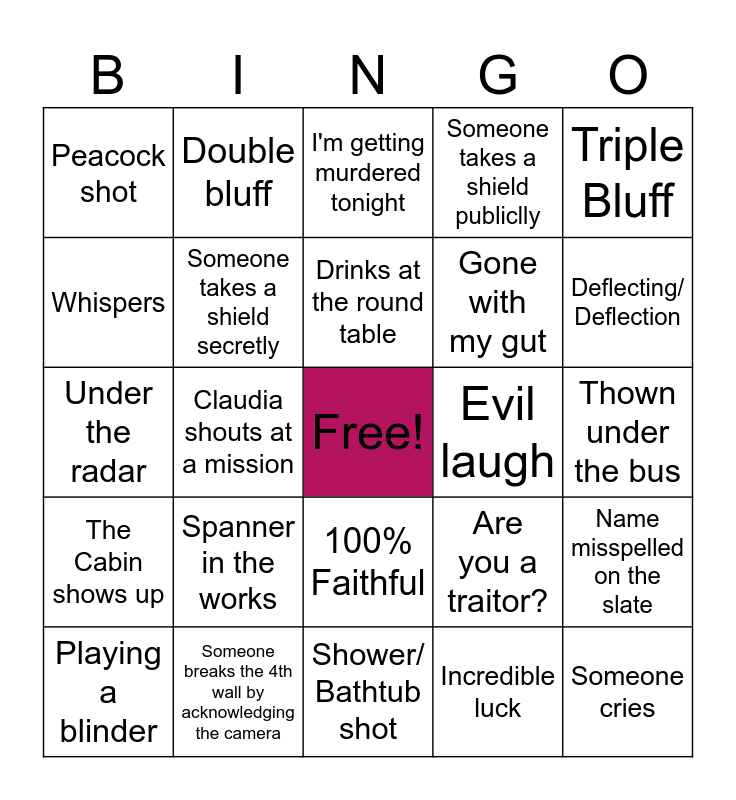 This bingo card has a free space and 24 words: Spanner in the works, Someone breaks the 4th wall by acknowledging the camera, Drinks at the round table, Playing a blinder, Triple Bluff, Peacock shot, Whispers, Double bluff, Evil laugh, 100% Faithful, Gone with my gut, Under the radar, Are you a traitor?, Name misspelled on the slate, Someone takes a shield secretly, Incredible luck, Thown under the bus, I'm getting murdered tonight, Deflecting/ Deflection, Claudia shouts at a mission, Someone cries, The Cabin shows up, Someone takes a shield publiclly and Shower/ Bathtub shot.