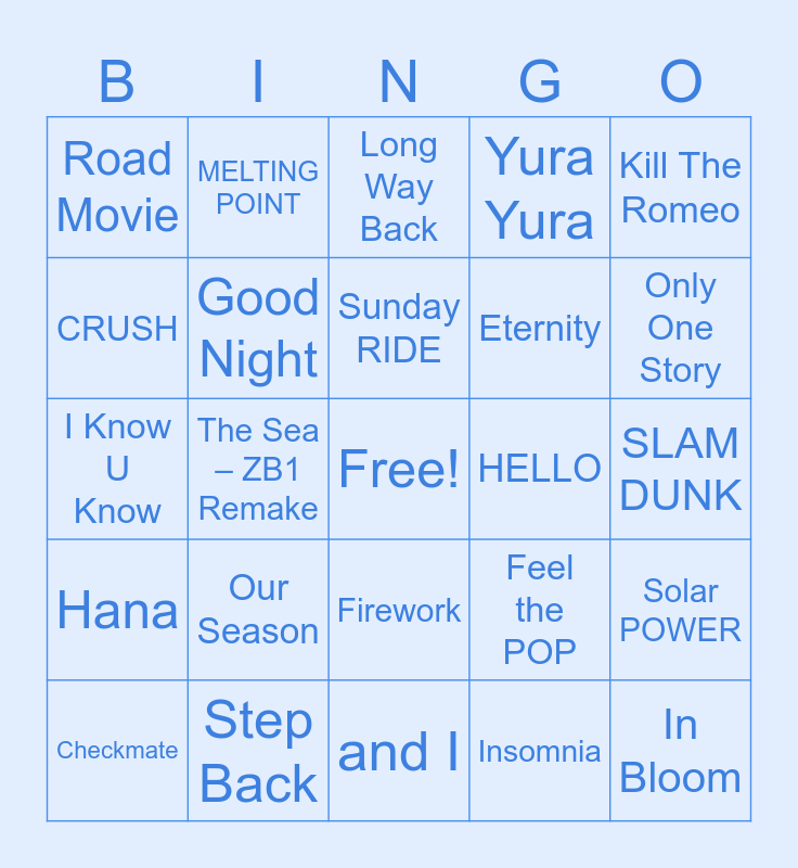 This bingo card has a free space and 48 words: Back to ZEROBASE, In Bloom, New Kidz on the Block, and I, Our Season, Always, MELTING POINT, Take My Hand, CRUSH, Kidz Zone, Good Night, Yura Yura, Solar POWER, Feel the POP, Dear ECLIPSE, SWEAT, Sunday RIDE, HELLO, Good So Bad, Kill The Romeo, The Sea – ZB1 Remake, Insomnia, Road Movie, Eternity, Reaching for you, Only One Story, Checkmate, NOW OR NEVER, Firework, Hana, BLUE, Devil Game, Doctor! Doctor!, Out of Love, Step Back, Cruel, ICONIK, SLAM DUNK, Lovesick Game, Goosebumps, Dumb, EXTRA, Long Way Back, Star Eyes, I Know U Know, Running to Future, ROSES and LOVEPOCALYPSE.