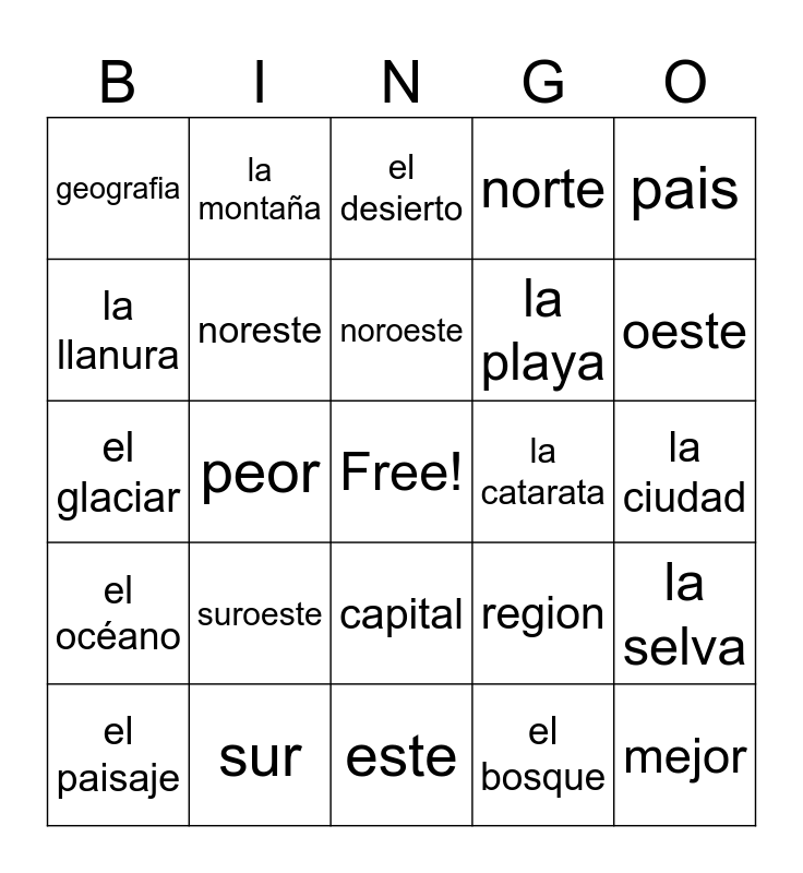 This bingo card has a free space and 28 words: la selva, el río, la playa, el bosque, la llanura, el desierto, la montaña, el océano, la catarata, el paisaje, el glaciar, norte, sur, este, oeste, sureste, suroeste, noreste, noroeste, capital, geografia, pais, mejor, peor, la ciudad, region, pais and lugar.