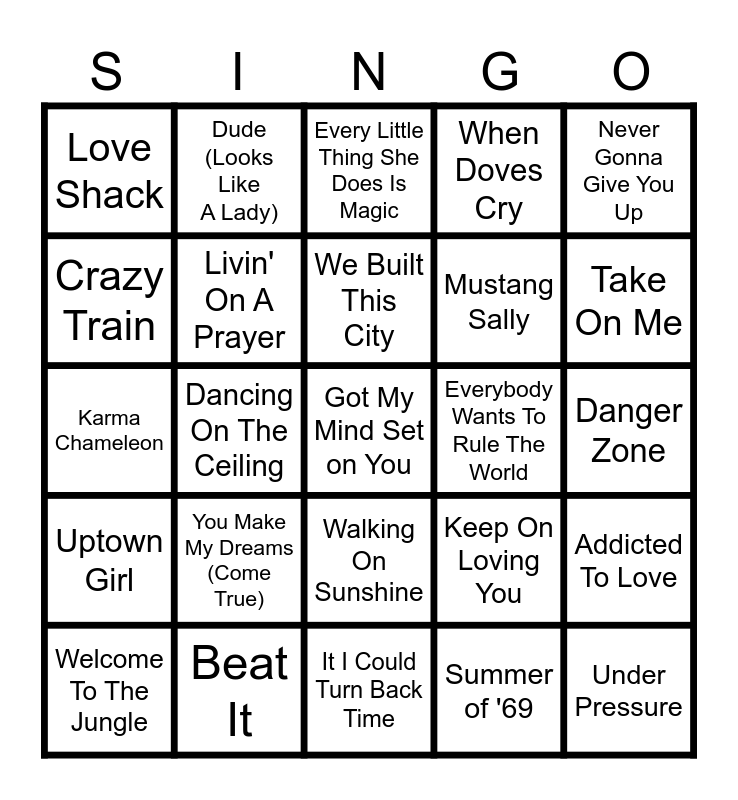 This bingo card has a free space and 41 words: Africa, Karma Chameleon, Wake Me Up Before You Go-Go, Livin' On A Prayer, Beat It, Walking On Sunshine, We Built This City, Jump, Never Gonna Give You Up, Uptown Girl, Dancing On The Ceiling, When Doves Cry, Under Pressure, Danger Zone, Everybody Wants To Rule The World, You Make My Dreams (Come True), Just Can't Get Enough, Love Shack, How Will I Know, Every Little Thing She Does Is Magic, Addicted To Love, The Loco-Motion, It I Could Turn Back Time, Mustang Sally, Manic Monday, Straight Up, Summer of '69, Don't Stop Believin', Take On Me, Jessie's Girl, Take Me Home Tonight, Dude (Looks Like A Lady), Welcome To The Jungle, The Final Countdown, Keep On Loving You, Crazy Train, With or Without, Girls, Girls, Girls, Nothin' But A Good Time, Crazy For You and The Power Of Love.