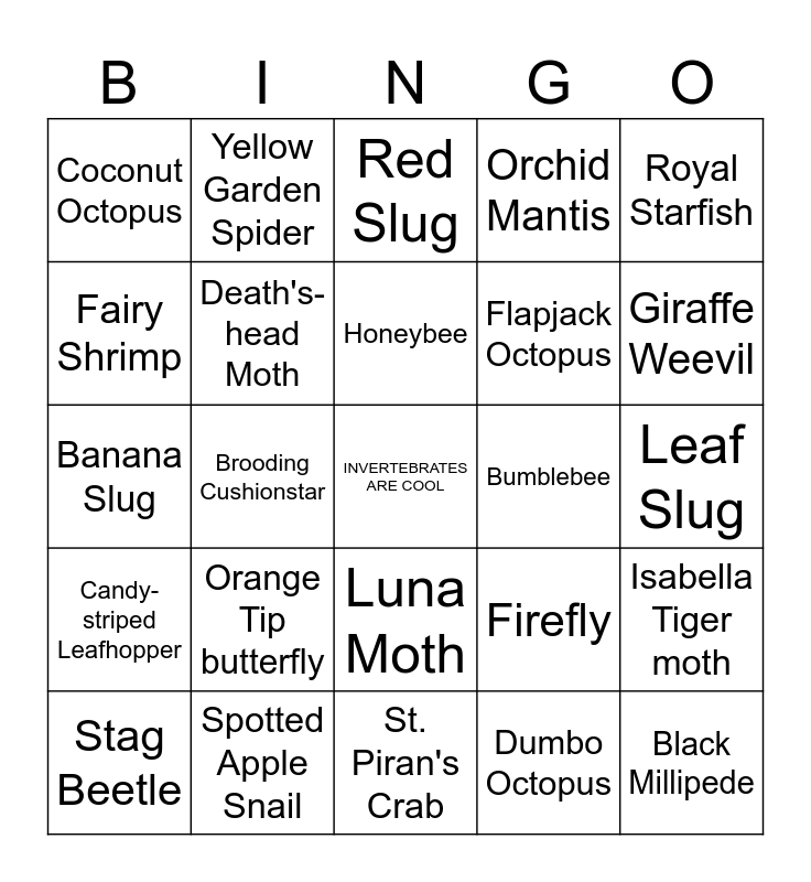 This bingo card has a free space and 49 words: Portuguese Man O' War, Black Millipede, White-clawed Crayfish, St. Piran's Crab, Orange Tip butterfly, The Purple Emperor, Yellow Garden Spider, Royal Sea Cucumber, Fairy Shrimp, Blue Crab, Death's-head Moth, Orchid Mantis, Isabella Tiger moth, Firefly, Candy Cane Snail, Colombian ramshorn apple snail, Honeybee, Bumblebee, Mantis Shrimp, Royal Starfish, Brooding Cushionstar, Dumbo Octopus, Coconut Octopus, Flapjack Octopus, Ladybug, Giraffe Weevil, Stag Beetle, Owlet Moth, Luna Moth, Candy-striped Leafhopper, Dragonfly, Eastern Tiger Swallowtail, Rhinoceros Beetle, Clear Glass Snail, Spotted Apple Snail, Jeweled Topsnail, Black Slug, Sea Bunny, Leaf Slug, The Spanish Dancer, The Blue Dragon, Pyjama Slug, The Boxer Crab, Soft Coral Porcelain Crab, Banana Slug, Red Slug, Red Triangle Slug, Firefly Squid and Vampire Squid.