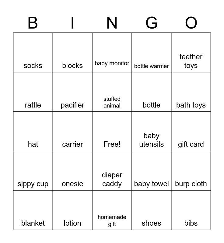 This bingo card has a free space and 24 words: onesie, lotion, stuffed animal, blanket, teether toys, socks, rattle, blocks, baby utensils, diaper caddy, bottle, hat, baby towel, burp cloth, pacifier, shoes, gift card, baby monitor, bath toys, carrier, bibs, sippy cup, bottle warmer and homemade gift.