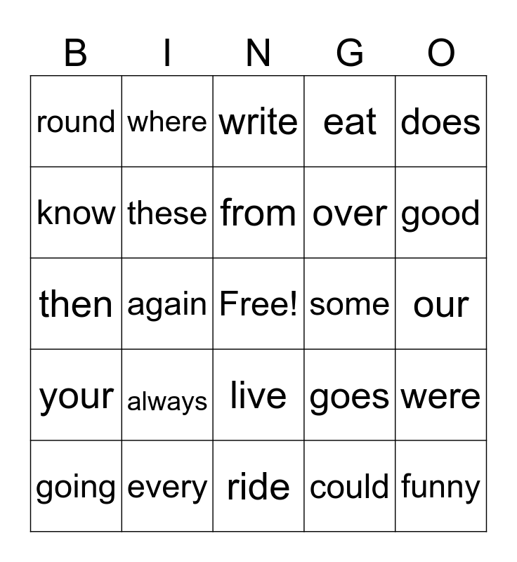 This bingo card has a free space and 24 words: always, every, from, going, does, round, know, where, some, live, over, then, goes, were, these, could, our, write, good, again, funny, your, eat and ride.