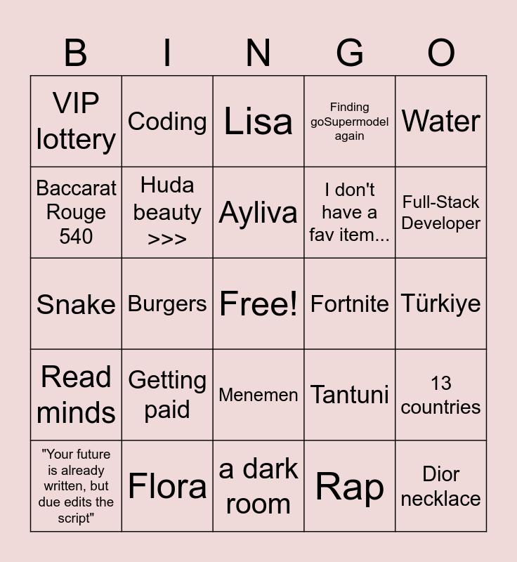 This bingo card has a free space and 66 words: Joined goSupermodel 10 December 2024, Swift, Eminem, 13 countries, Don't collect anything, 2 cats, Coding, 10 things I hate about you, Ayliva, No hobbies, Menemen, No games on my phone (lol), Türkiye, Water, Help people, Baccarat Rouge 540, Burgers, VIP lottery, during the day, I don't have a fav item..., Getting paid, Read minds, Finding goSupermodel again, Ayliva - Aber Sie, Bear, Red, Tagliatelle, 26, Dior necklace, With a topping of Lotus, "Your future is already written, but due edits the script", Mommy, Summer, Saudi Arabia, Tantuni, Flora, warm hands, Snake, Rap, would still pick my name, Huda beauty >>>, Cars, Fortnite, Roses, Bratz, Quackie, Full-Stack Developer, Pink, 38.5, don't go to concerts, I don't eat candy, visit Mecca, rainy days, 8%, 5, BlackBerry, Stradivarius, Night owl, Lisa, a dark room, Coke, Ice cream with sprinkles, Margarita, Night, All colors and Banana :d.