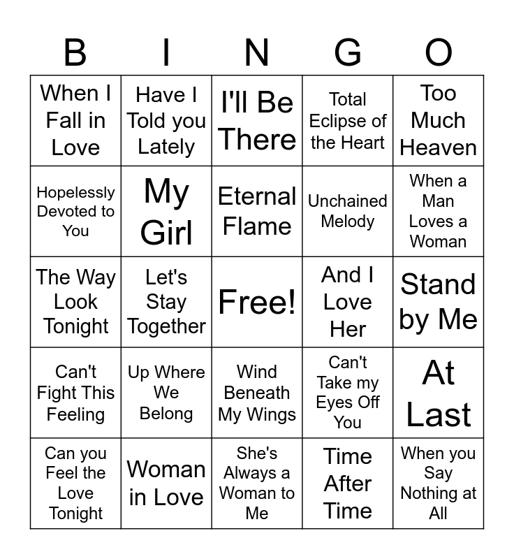 This bingo card has a free space and 24 words: Up Where We Belong, Woman in Love, Eternal Flame, Can you Feel the Love Tonight, Too Much Heaven, When I Fall in Love, Hopelessly Devoted to You, Have I Told you Lately, And I Love Her, Wind Beneath My Wings, Unchained Melody, The Way Look Tonight, Can't Take my Eyes Off You, At Last, My Girl, Time After Time, Stand by Me, I'll Be There, When a Man Loves a Woman, Let's Stay Together, When you Say Nothing at All, Can't Fight This Feeling, Total Eclipse of the Heart and She's Always a Woman to Me.