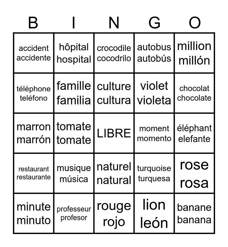 This bingo card has a free space and 24 words: musique música, professeur profesor, culture cultura, minute minuto, million millón, accident accidente, téléphone teléfono, hôpital hospital, moment momento, naturel natural, violet violeta, marron marrón, turquoise turquesa, rose rosa, famille familia, lion león, éléphant elefante, crocodile cocodrilo, chocolat chocolate, tomate tomate, banane banana, restaurant restaurante, autobus autobús and rouge rojo.