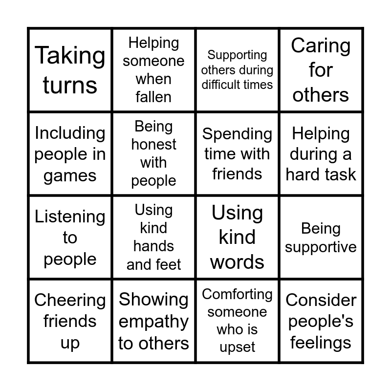This bingo card has 16 words: Showing empathy to others, Being supportive, Supporting others during difficult times, Taking turns, Listening to people, Helping someone when fallen, Using kind words, Comforting someone who is upset, Including people in games, Being honest with people, Cheering friends up, Caring for others, Using kind hands and feet, Helping during a hard task, Spending time with friends and Consider people's feelings.