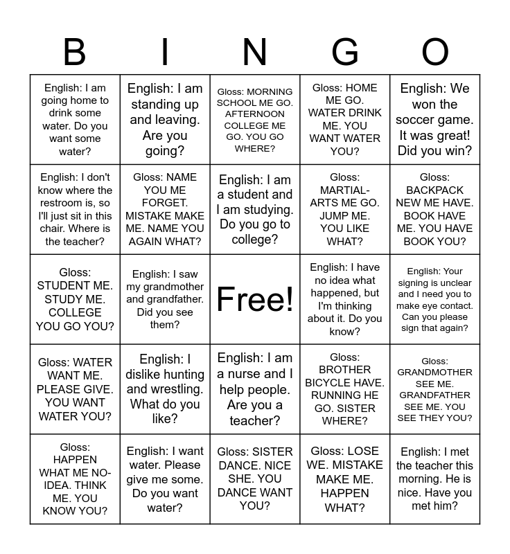 This bingo card has a free space and 80 words: Gloss: HELLO. NAME ME [NAME]. NAME YOU WHAT?, English: Hello. My name is [Name]. What is your name?, Gloss: MORNING SCHOOL ME GO. AFTERNOON COLLEGE ME GO. YOU GO WHERE?, English: I’m going to school this morning and college this afternoon. Where are you going?, Gloss: NURSE ME SEE. SICK ME. YOU SICK YOU?, English: I saw the nurse because I am sick. Are you sick?, Gloss: BROTHER BASKETBALL LIKE. SISTER VOLLEYBALL LIKE. FAMILY YOU LIKE WHAT?, English: My brother likes basketball and my sister likes volleyball. What does your family like?, Gloss: NIGHT FOOTBALL GAME ME GO. SUNDAY SWIMMING ME GO. YOU GO WHERE?, English: I’m going to a football game tonight and swimming on Sunday. Where are you going?, Gloss: SIGN NEW ME LEARN. UNDERSTAND ME. YOU UNDERSTAND YOU?, English: I learned a new sign and I understand it. Do you understand?, Gloss: HOME ME GO. WATER DRINK ME. YOU WANT WATER YOU?, English: I am going home to drink some water. Do you want some water?, Gloss: RESTRROM WHERE ME NO-IDEA. CHAIR SIT ME. TEACHER WHERE?, English: I don't know where the restroom is, so I'll just sit in this chair. Where is the teacher?, Gloss: HUNTING ME DISLIKE. WRESTLING ME DISLIKE. YOU LIKE WHAT?, English: I dislike hunting and wrestling. What do you like?, Gloss: SIGN UNCLEAR. EYE-CONTACT NEED. AGAIN SIGN PLEASE?, English: Your signing is unclear and I need you to make eye contact. Can you please sign that again?, Gloss: SOCCER GAME WIN WE. ALL-RIGHT! YOU WIN YOU?, English: We won the soccer game. It was great! Did you win?, Gloss: STUDENT ME. STUDY ME. COLLEGE YOU GO YOU?, English: I am a student and I am studying. Do you go to college?, Gloss: NAME YOU ME FORGET. MISTAKE MAKE ME. NAME YOU AGAIN WHAT?, English: I forgot your name; I made a mistake. What was your name again?, Gloss: FATHER COME. WAIT ME. PARENTS YOU WHERE?, English: My father is coming, so I am waiting. Where are your parents?, Gloss: BOARD-GAME ME HAVE. PLAY WANT ME. YOU PLAY WANT YOU?, English: I have a board game and I want to play. Do you want to play?, Gloss: BACKPACK NEW ME HAVE. BOOK HAVE ME. YOU HAVE BOOK YOU?, English: I have a new backpack and I have my book. Do you have your book?, Gloss: SISTER DANCE. NICE SHE. YOU DANCE WANT YOU?, English: My sister is dancing; she is very good. Do you want to dance?, Gloss: HAPPEN WHAT ME NO-IDEA. THINK ME. YOU KNOW YOU?, English: I have no idea what happened, but I'm thinking about it. Do you know?, Gloss: TIME WHAT? BUSY ME. YOU BUSY YOU?, English: What time is it? I am busy. Are you busy?, Gloss: MORNING ME MEET TEACHER. NICE HE. YOU MEET HE YOU?, English: I met the teacher this morning. He is nice. Have you met him?, Gloss: SCHOOL NEAR. WALK ME. HOME YOU WHERE?, English: The school is nearby, so I am walking. Where is your home?, Gloss: ASK NEED ME. HELP WANT ME. YOU HELP ME YOU?, English: I need to ask something and I want help. Will you help me?, Gloss: STAND ME. GO ME. YOU GO YOU?, English: I am standing up and leaving. Are you going?, Gloss: BOOK READ ME. GOOD THING. YOU READ YOU?, English: I am reading a book. It’s a good thing. Do you read?, Gloss: NIGHT CHILL ME. NOTHING ME DO. YOU DO WHAT?, English: I'm just chilling tonight and doing nothing. What are you doing?, Gloss: GRANDMOTHER SEE ME. GRANDFATHER SEE ME. YOU SEE THEY YOU?, English: I saw my grandmother and grandfather. Did you see them?, Gloss: BROTHER BICYCLE HAVE. RUNNING HE GO. SISTER WHERE?, English: My brother has a bicycle and went running. Where is my sister?, Gloss: BELL-RING. STOP SIGN. CLASS START WHEN?, English: The bell rang, so stop signing. When does class start?, Gloss: SURE ME. WIN WE. YOU SURE YOU?, English: I am certain that we will win. Are you sure?, Gloss: NURSE ME. HELP PEOPLE ME. TEACHER YOU YOU?, English: I am a nurse and I help people. Are you a teacher?, Gloss: MARTIAL-ARTS ME GO. JUMP ME. YOU LIKE WHAT?, English: I’m going to martial arts and doing a lot of jumping. What do you like?, Gloss: TEACHER SAY WHAT? NOT-UNDERSTAND ME. YOU UNDERSTAND YOU?, English: What did the teacher say? I didn't understand. Did you understand?, Gloss: BICYCLE ME HAVE. SCHOOL GO ME. YOU BICYCLE HAVE YOU?, English: I have a bicycle and I use it to go to school. Do you have a bicycle?, Gloss: SIBLINGS HAVE ME. BROTHER TWO. YOU SIBLINGS HAVE YOU?, English: I have siblings; I have two brothers. Do you have siblings?, Gloss: NIGHT STUDY ME. WAIT ME. YOU STUDY WHAT?, English: I’m studying tonight, so I’m waiting. What are you studying?, Gloss: WATER WANT ME. PLEASE GIVE. YOU WANT WATER YOU?, English: I want water. Please give me some. Do you want water?, Gloss: WHAT'S-UP? NOTHING MUCH ME. YOU GOOD YOU?, English: What's up? Not much with me. Are you good?, Gloss: UNCLE COME. AUNT COME. YOU MEET WANT YOU?, English: My uncle and aunt are coming. Do you want to meet them?, Gloss: LOSE WE. MISTAKE MAKE ME. HAPPEN WHAT?, English: We lost. I made a mistake. What happened?, Gloss: WORK STOP. HOME GO. YOU GO HOME YOU? and English: I’m stopping work and going home. Are you going home?.