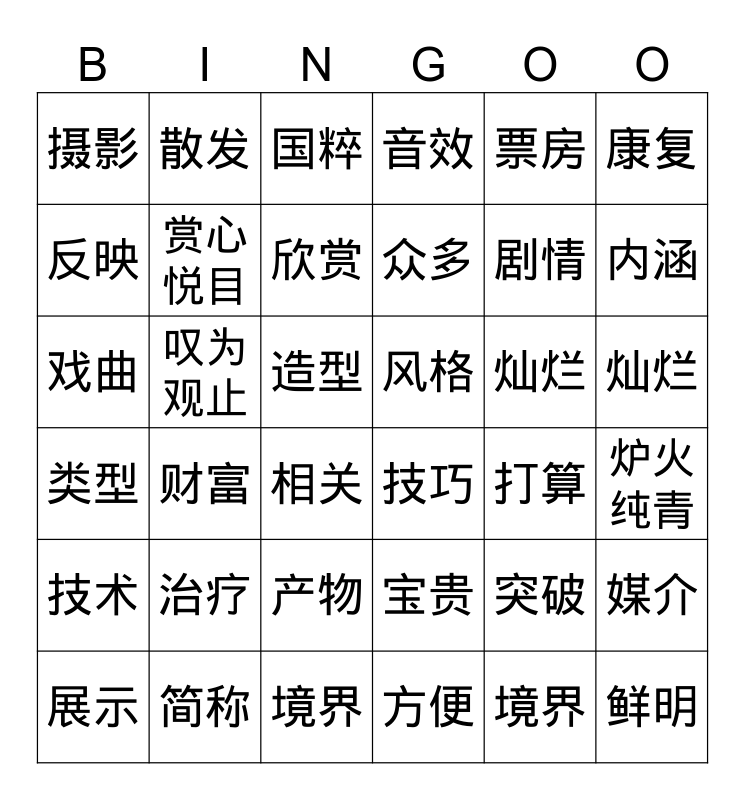 This bingo card has 36 words: 宝贵, 产物, 方便, 反映, 类型, 风格, 赏心悦目, 境界, 票房, 突破, 内涵, 音效, 媒介, 叹为观止, 众多, 摄影, 技术, 灿烂, 戏曲, 国粹, 造型, 财富, 技巧, 相关, 打算, 散发, 剧情, 简称, 欣赏, 康复, 鲜明, 展示, 炉火纯青, 灿烂, 治疗 and 境界.