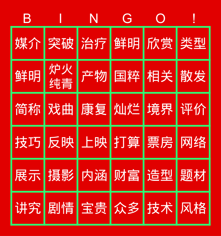 This bingo card has 36 words: 财富, 内涵, 众多, 鲜明, 技巧, 灿烂, 炉火纯青, 宝贵, 欣赏, 造型, 散发, 鲜明, 题材, 戏曲, 国粹, 媒介, 展示, 境界, 简称, 治疗, 康复, 反映, 打算, 上映, 票房, 突破, 相关, 剧情, 产物, 类型, 风格, 讲究, 网络, 评价, 摄影 and 技术.