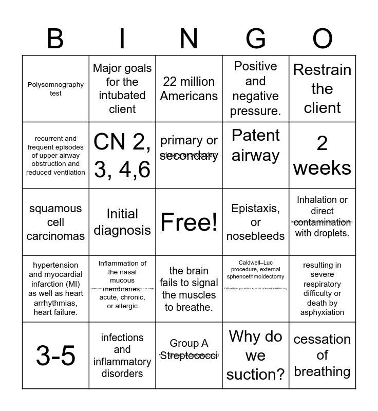 This bingo card has 6 images, a free space and 24 words: Inflammation of the nasal mucous membranes; acute, chronic, or allergic, infections and inflammatory disorders, primary or secondary, 3-5, Restrain the client, Polysomnography test, recurrent and frequent episodes of upper airway obstruction and reduced ventilation, Major goals for the intubated client, Epistaxis, or nosebleeds, the brain fails to signal the muscles to breathe., Patent airway, squamous cell carcinomas, Caldwell–Luc procedure, external sphenoethmoidectomy, resulting in severe respiratory difficulty or death by asphyxiation, CN 2, 3, 4,6, Why do we suction?, Inhalation or direct contamination with droplets., 22 million Americans, 2 weeks, Initial diagnosis, cessation of breathing, hypertension and myocardial infarction (MI) as well as heart arrhythmias, heart failure., Positive and negative pressure. and Group A Streptococci.