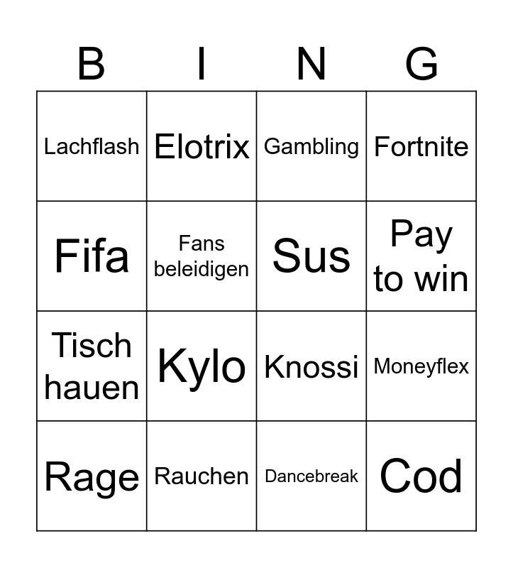 This bingo card has 16 words: Rage, Rauchen, Gambling, Fortnite, Fifa, Elotrix, Knossi, Moneyflex, Lachflash, Fans beleidigen, Dancebreak, Pay to win, Tisch hauen, Kylo, Sus and Cod.
