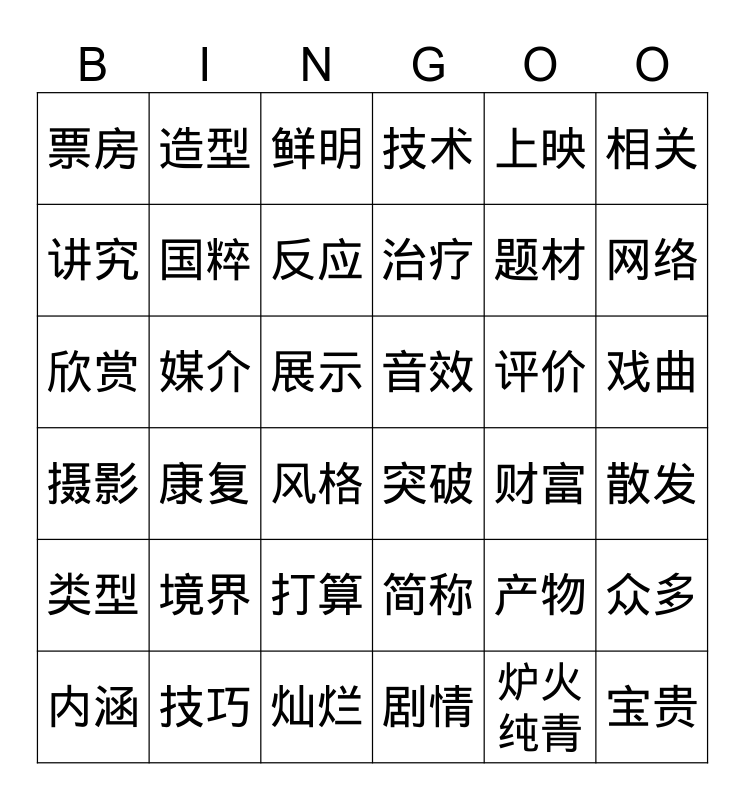 This bingo card has 36 words: 简称, 打算, 剧情, 讲究, 摄影, 音效, 国粹, 灿烂, 上映, 产物, 网络, 技术, 众多, 媒介, 治疗, 票房, 类型, 评价, 欣赏, 鲜明, 展示, 康复, 突破, 风格, 财富, 造型, 题材, 技巧, 反应, 相关, 宝贵, 内涵, 散发, 戏曲, 境界 and 炉火纯青.