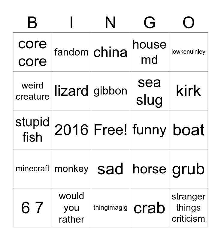 This bingo card has a free space and 24 words: monkey, would you rather, gibbon, 6 7, lowkenuinley, core core, weird creature, fandom, funny, sad, sea slug, stupid fish, horse, grub, lizard, crab, boat, china, kirk, 2016, stranger things criticism, minecraft, house md and thingimagig.