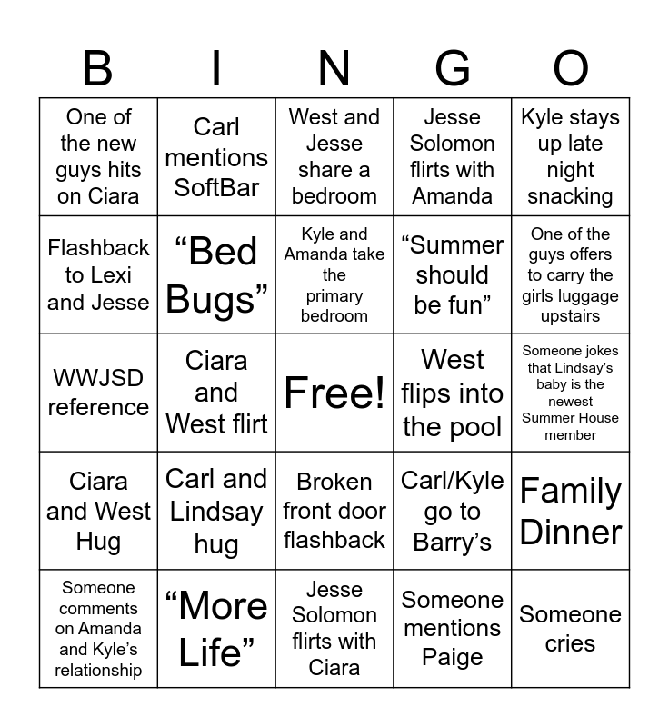 This bingo card has a free space and 40 words: Jesse Solomon sings, WWJSD reference, Kyle tinkers with his DJ equipment, “Bed Bugs”, “More Life”, Broken front door flashback, Kyle and Amanda take the primary bedroom, 3+ Lover Boy flavors spotted, Kyle stays up late night snacking, Ciara and West Hug, Ciara and West flirt, Jesse Solomon flirts with Amanda, Someone cries, Someone jokes that Lindsay’s baby is the newest Summer House member, West flips into the pool, Carl and Lindsay hug, Jesse Solomon hits on one of the new girls, One of the new guys hits on Ciara, Shot of the Amazon boxes piled at the door, West and Jesse share a bedroom, Family Dinner, Someone mentions Paige, “Summer should be fun”, Flashback to Lexi and Jesse, Ciara has a conversation in bed, One of the rooms has drastically changed, West wears something KC/Missouri themed, Someone kisses (can include Kyle and Amanda), Ciara mentions her cat Jasper, Ciara thanks Prozac, West makes Ciara laugh, Someone comments on Amanda and Kyle’s relationship, Ciara wears a costume, Carl/Kyle go to Barry’s, One of the guys offers to carry the girls luggage upstairs, Jesse Solomon flirts with Ciara, Jesse Solomon flights with a new girl, “Jesse Solomon”, Carl mentions SoftBar and Carl flirts with Ciara.