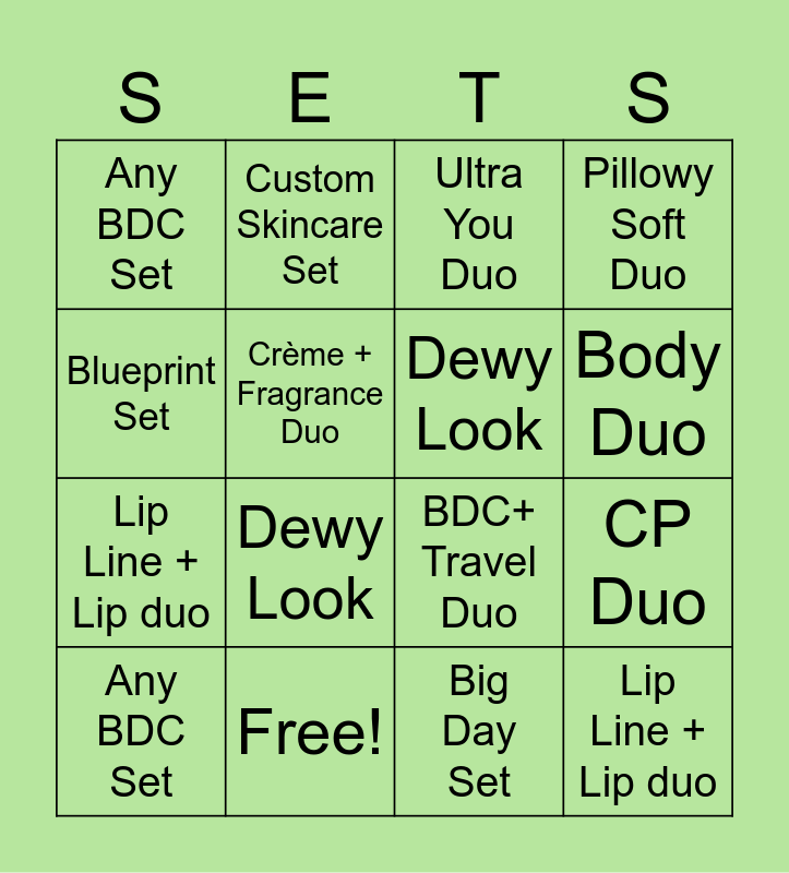 This bingo card has 24 words: Blueprint Set, Fragrance 2-ways, Body Duo, Brow Duo, Blueprint Set, Any BDC Set, Crème + Fragrance Duo, Custom Skincare Set, Free!, Travel Fragrance Trio, Lip Line + Lip duo, BDC+ Travel Duo, BDC + Travel, Complexion Set, Dewy Look, Complexion Set, Big Day Set, Ultra You Duo, Dewy Look, CP Duo, Any BDC Set, Lip Line + Lip duo, Pillowy Soft Duo and Brow Duo.