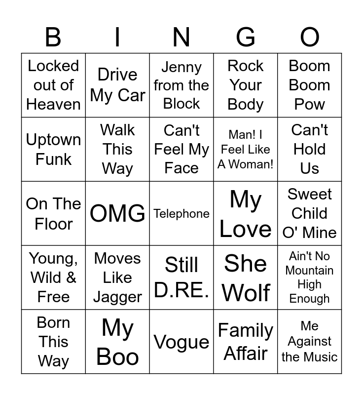 This bingo card has 55 words: Dark Horse, Born This Way, Viva La Vida, Locked out of Heaven, Vogue, It's Gonna Be Me, Walk This Way, Beautiful Day, Man! I Feel Like A Woman!, Message In A Bottle, Rock Your Body, Live And Let Die, Start Me Up, Baby I'm a Star, I Won't Back Down, Pinball Wizard, Boom Boom Pow, OMG, Love On Top, Telephone, My Love, Harder To Breathe, She Wolf, Jenny from the Block, Born in the U.S.A, Can't Feel My Face, Family Affair, Where Have You Been, Sweet Child O' Mine, Ain't No Mountain High Enough, Blinding Lights, 1999, Party Rock Anthem, Glory Days, Uptown Funk, On The Floor, Don't Stop The Music, Young, Wild & Free, Me Against the Music, Just A Girl, Drive My Car, Last Friday Night (T.G.I.F), Motownphilly, Formation, Moves Like Jagger, My Boo, luther, American Woman, Dream On, Can't Hold Us, Hey Jude, Lose Yourself, Empire State Of Mind, Still D.RE. and Crazy.