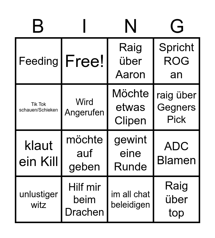 This bingo card has 16 words: Hilf mir beim Drachen, ADC Blamen, Raig über Aaron, Feeding, klaut ein Kill, Free!, gewint eine Runde, im all chat beleidigen, Tik Tok schauen/Schieken, Wird Angerufen, unlustiger witz, Spricht ROG an, möchte auf geben, raig über Gegners Pick, Möchte etwas Clipen and Raig über top.