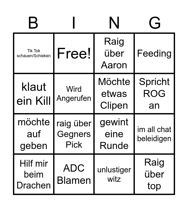 This bingo card has 16 words: Hilf mir beim Drachen, ADC Blamen, Raig über Aaron, Feeding, klaut ein Kill, Free!, gewint eine Runde, im all chat beleidigen, Tik Tok schauen/Schieken, Wird Angerufen, unlustiger witz, Spricht ROG an, möchte auf geben, raig über Gegners Pick, Möchte etwas Clipen and Raig über top.