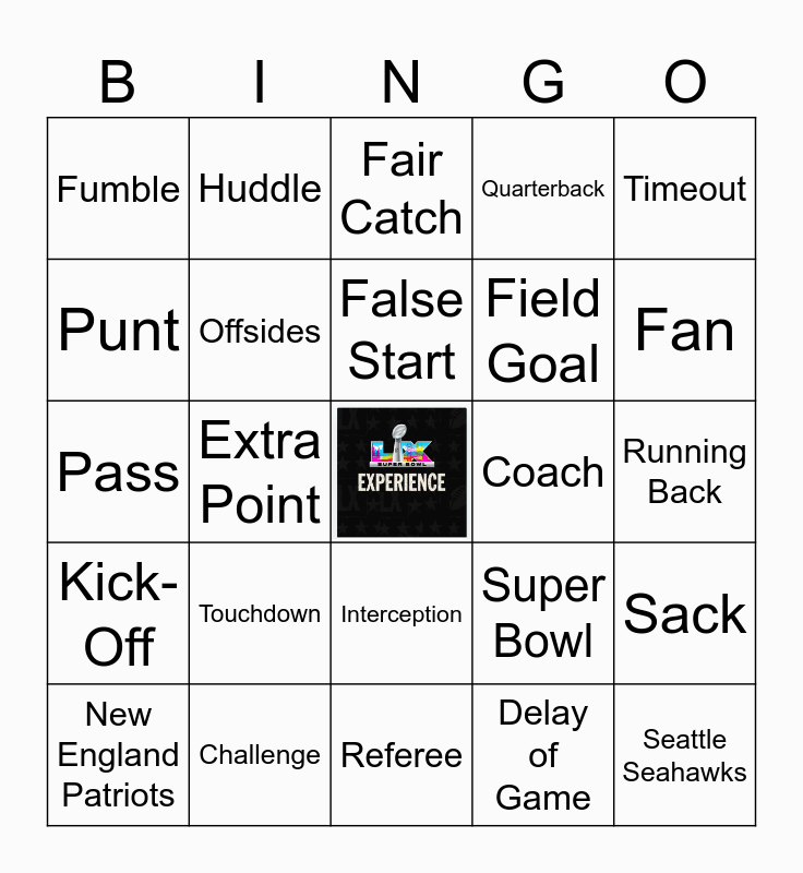 This bingo card has a free space and 24 words: Touchdown, Challenge, False Start, New England Patriots, Timeout, Fumble, Punt, Huddle, Coach, Interception, Field Goal, Pass, Super Bowl, Sack, Offsides, Delay of Game, Running Back, Fair Catch, Fan, Extra Point, Seattle Seahawks, Kick-Off, Quarterback and Referee.