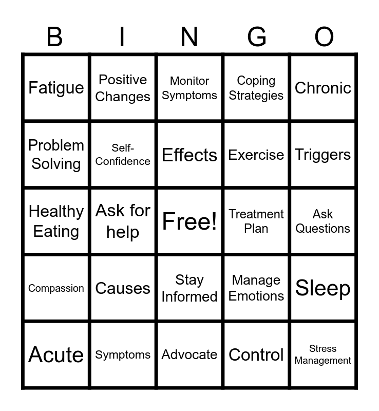 This bingo card has a free space and 24 words: Causes, Symptoms, Effects, Acute, Chronic, Fatigue, Problem Solving, Positive Changes, Treatment Plan, Stay Informed, Exercise, Healthy Eating, Manage Emotions, Sleep, Self-Confidence, Control, Ask Questions, Monitor Symptoms, Triggers, Ask for help, Stress Management, Compassion, Coping Strategies and Advocate.
