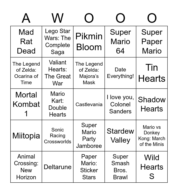 This bingo card has 76 words: Kingdom Hearts, Donkey Kong Bananza, Pikmin Bloom, Minecraft, The Legend of Zelda, The Legend of Zelda: Twilight Princess, Kirby Star Allies, Super Mario Odyssey, Super Princess Peach, Mario Bros. 2 (US), Wild Hearts S, Luigi’s Mansion 3, The Legend of Zelda: Majora’s Mask, The Legend of Zelda: Ocarina of Time, Sayonara Wild Hearts, Mario Kart: Double Hearts, Alice Madness Returns, Castlevania, Castle of Heart, Super Paper Mario, Pokémon Puzzle League, Mortal Kombat 1, Valiant Hearts: The Great War, Lego Star Wars: The Complete Saga, Super Mario 64, Bubble Bobble, Pokémon Gold, Silver and Crystal, Monster Legends, Undertale, Popeye, Jackbox Trivia Murder Party, Fire Emblem: Three Houses, Genshin Impact, Stardew Valley, Tin Hearts, Date Everything!, Sonic Adventure 2, Tomodachi Life, Shadow Hearts, Super Smash Bros. Brawl, Persona 5, Boyfriend Dungeon, Tales of Hearts, Among Us, Demon Slayer, Portal, Animal Crossing: New Horizon, Mad Rat Dead, Xenoblade Chronicles X, Paper Mario 64, Yoshi Story, Super Mario Party Jamboree, The Binding of Isaac, Project Rub, Super Metroid (Heart Room), Turnip Boy Commits Tax Evasion, Pokémon Legends Arceus, The Rub Rabbids, Pokémon Ruby, Sapphire and Emerald, Mario + Rabbids, Sonic Racing Crossworlds, Lufia ll, Donkey Kong Country: Tropical Freeze, Celeste, The Legend of Zelda: Wind Waker, Hatoful Boyfriend, I love you, Colonel Sanders, Paper Mario: The Thousand Year Door, Banjo-Kazooie, Jackbox Monster Seeking Monster, Mario vs Donkey Kong: March of the Minis, Miitopia, Deltarune, The Legend of Zelda: Spirit Tracks, Paper Mario: Sticker Stars and Nefarious.