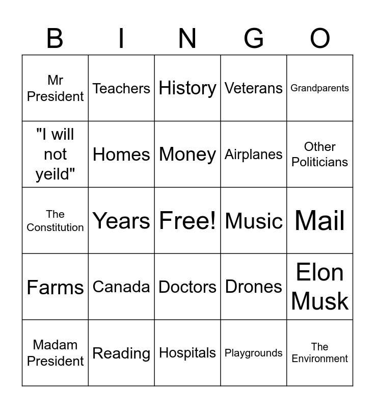 This bingo card has a free space and 24 words: Canada, Reading, Money, Madam President, Grandparents, Mr President, "I will not yeild", Teachers, Music, Doctors, Airplanes, The Constitution, Drones, Elon Musk, Homes, Playgrounds, Mail, History, Other Politicians, Years, The Environment, Farms, Veterans and Hospitals.