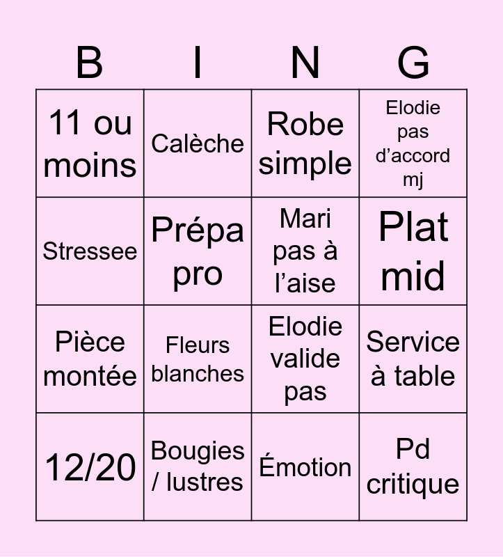 This bingo card has 16 words: Bougies / lustres, Service à table, Robe simple, 11 ou moins, Pièce montée, Calèche, Elodie valide pas, Émotion, Stressee, Prépa pro, 12/20, Elodie pas d’accord mj, Fleurs blanches, Plat mid, Mari pas à l’aise and Pd critique.