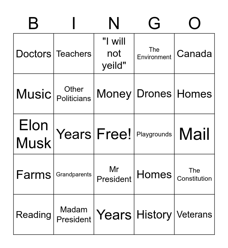 This bingo card has a free space and 24 words: Grandparents, Madam President, Money, Reading, Canada, Doctors, Music, Teachers, Playgrounds, Mr President, Drones, Elon Musk, Homes, The Constitution, Other Politicians, History, Mail, "I will not yeild", Homes, Years, Veterans, Farms, The Environment and Years.