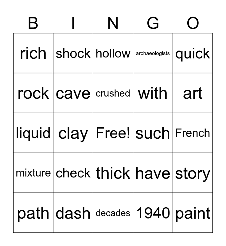This bingo card has a free space and 24 words: check, dash, crushed, path, quick, rich, rock, shock, such, thick, with, liquid, have, story, cave, 1940, French, hollow, art, clay, paint, mixture, archaeologists and decades.