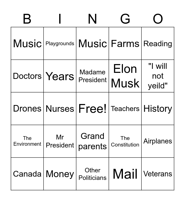 This bingo card has a free space and 24 words: Mr President, Money, Madame President, Canada, Reading, Music, Doctors, Playgrounds, Teachers, Grand parents, Elon Musk, Drones, The Constitution, Airplanes, Years, Mail, History, Music, "I will not yeild", Nurses, Veterans, The Environment, Farms and Other Politicians.