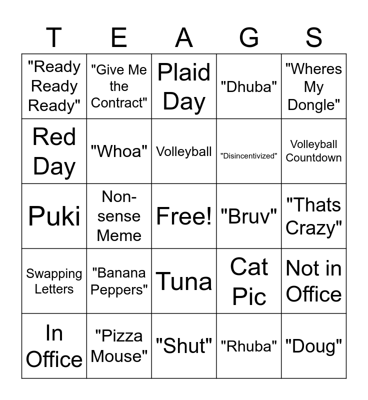 This bingo card has a free space and 24 words: "Banana Peppers", "Pizza Mouse", Volleyball, In Office, "Wheres My Dongle", "Ready Ready Ready", Red Day, "Give Me the Contract", "Bruv", Tuna, "Disincentivized", Puki, Cat Pic, Not in Office, "Whoa", "Rhuba", "Thats Crazy", Plaid Day, Volleyball Countdown, Non-sense Meme, "Doug", Swapping Letters, "Dhuba" and "Shut".