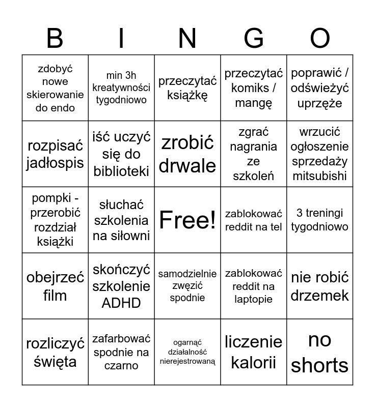 This bingo card has a free space and 24 words: skończyć szkolenie ADHD, zafarbować spodnie na czarno, zrobić drwale, rozliczyć święta, poprawić / odświeżyć uprzęże, zdobyć nowe skierowanie do endo, rozpisać jadłospis, min 3h kreatywności tygodniowo, zablokować reddit na tel, samodzielnie zwęzić spodnie, zgrać nagrania ze szkoleń, pompki - przerobić rozdział książki, zablokować reddit na laptopie, nie robić drzemek, iść uczyć się do biblioteki, liczenie kalorii, 3 treningi tygodniowo, przeczytać książkę, wrzucić ogłoszenie sprzedaży mitsubishi, słuchać szkolenia na siłowni, no shorts, obejrzeć film, przeczytać komiks / mangę and ogarnąć działalność nierejestrowaną.