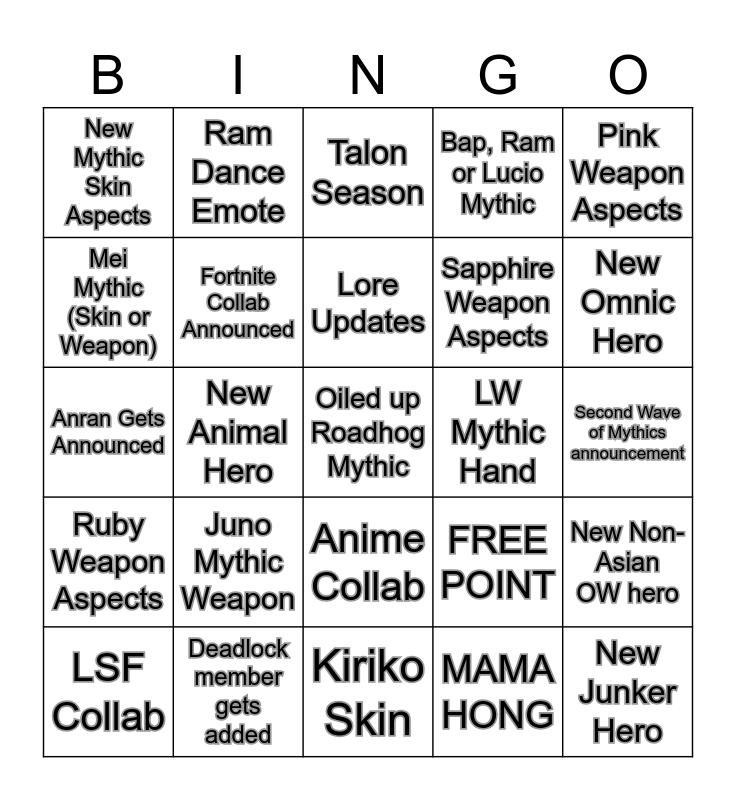 This bingo card has 25 words: Juno Mythic Weapon, Kiriko Skin, Lore Updates, LSF Collab, Pink Weapon Aspects, New Mythic Skin Aspects, Mei Mythic (Skin or Weapon), Ram Dance Emote, LW Mythic Hand, Anime Collab, Sapphire Weapon Aspects, Anran Gets Announced, FREE POINT, New Non-Asian OW hero, Fortnite Collab Announced, New Junker Hero, Second Wave of Mythics announcement, Talon Season, New Omnic Hero, New Animal Hero, Oiled up Roadhog Mythic, Deadlock member gets added, Ruby Weapon Aspects, Bap, Ram or Lucio Mythic and MAMA HONG.