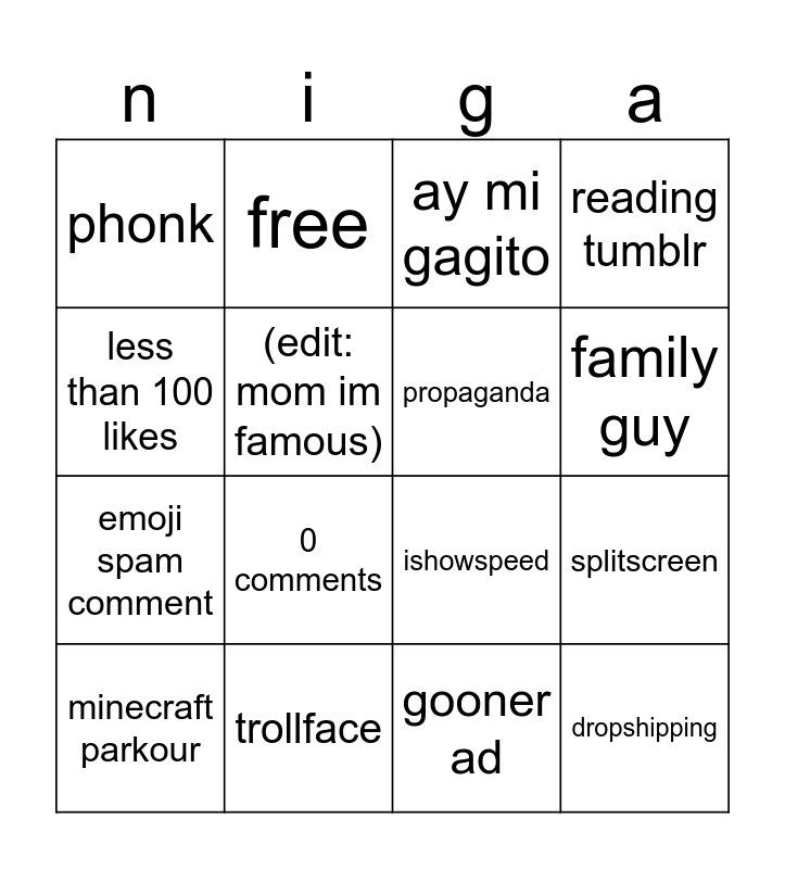 This bingo card has 16 words: trollface, splitscreen, ay mi gagito, phonk, emoji spam comment, free, ishowspeed, gooner ad, less than 100 likes, (edit: mom im famous), minecraft parkour, reading tumblr, 0 comments, family guy, propaganda and dropshipping.