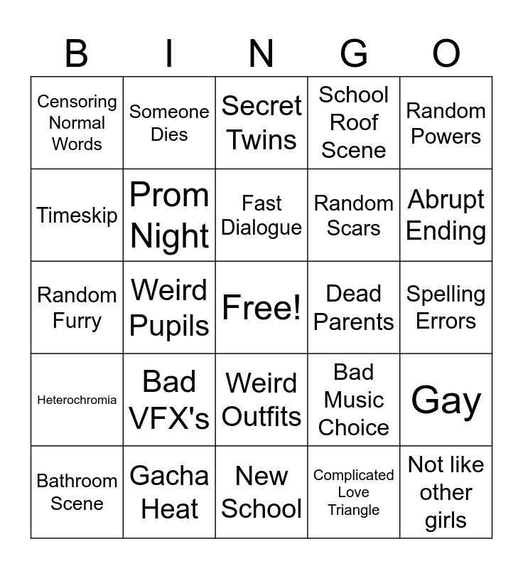 This bingo card has a free space and 24 words: Bad VFX's, Gacha Heat, Fast Dialogue, Bathroom Scene, Random Powers, Censoring Normal Words, Timeskip, Someone Dies, Dead Parents, Weird Outfits, Random Scars, Random Furry, Bad Music Choice, Gay, Prom Night, Complicated Love Triangle, Spelling Errors, Secret Twins, Abrupt Ending, Weird Pupils, Not like other girls, Heterochromia, School Roof Scene and New School.