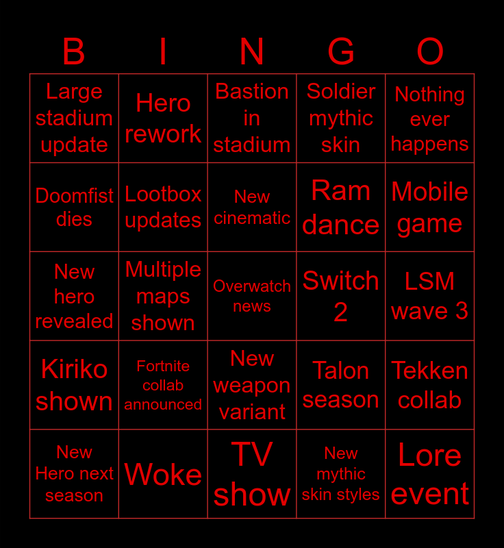 This bingo card has a free space and 24 words: Fortnite collab announced, Woke, New cinematic, New Hero next season, Nothing ever happens, Large stadium update, Doomfist dies, Hero rework, Switch 2, New weapon variant, Ram dance, New hero revealed, Talon season, Tekken collab, Lootbox updates, New mythic skin styles, LSM wave 3, Bastion in stadium, Mobile game, Multiple maps shown, Lore event, Kiriko shown, Soldier mythic skin and TV show.