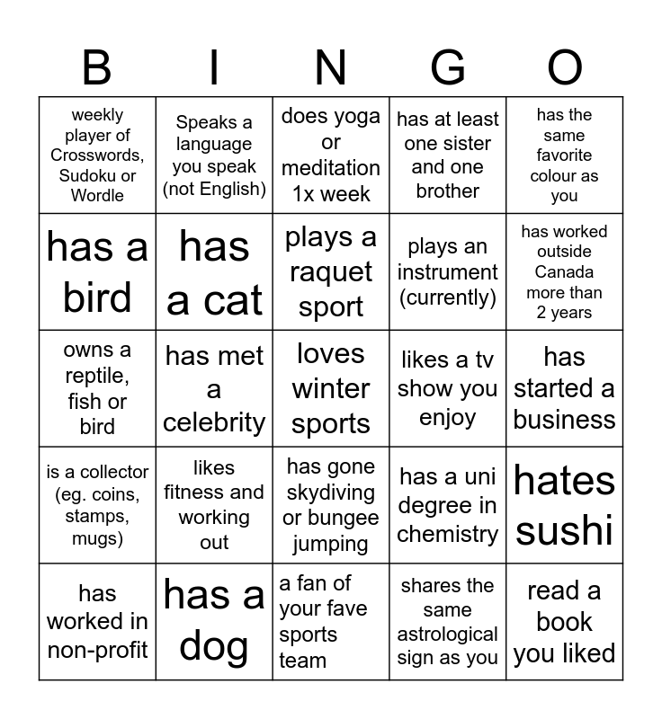 This bingo card has 30 words: has a dog, loves camping, has met a celebrity, can do a cartwheel, weekly player of Crosswords, Sudoku or Wordle, does yoga or meditation 1x week, has a cat, has gone skydiving or bungee jumping, likes a tv show you enjoy, a fan of your fave sports team, has started a business, loves winter sports, shares the same astrological sign as you, read a book you liked, has worked outside Canada more than 2 years, can juggle or do magic trick, has a uni degree in chemistry, is a collector (eg. coins, stamps, mugs), likes fitness and working out, has the same favorite colour as you, owns a reptile, fish or bird, can knit or crochet, Speaks a language you speak (not English), plays an instrument (currently), has a bird, has at least one sister and one brother, hates sushi, has worked in non-profit, plays a raquet sport and shares a hobby with you.