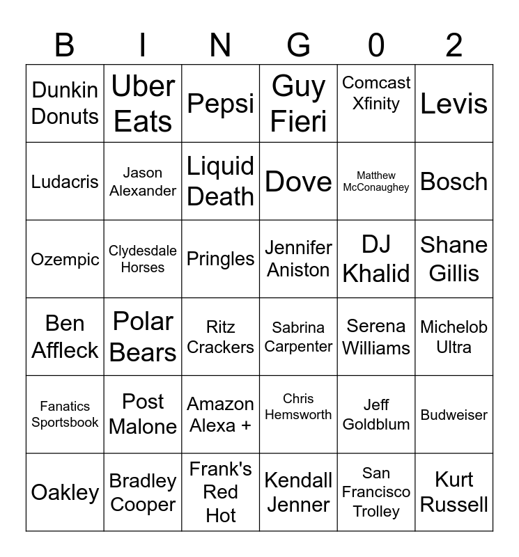 This bingo card has 36 words: Chris Hemsworth, Amazon Alexa +, Kendall Jenner, Ludacris, Ben Affleck, Jennifer Aniston, Jason Alexander, Frank's Red Hot, Comcast Xfinity, Jeff Goldblum, Bosch, Guy Fieri, Budweiser, Clydesdale Horses, Dove, Dunkin Donuts, Fanatics Sportsbook, DJ Khalid, Ozempic, Pepsi, Pringles, Polar Bears, Sabrina Carpenter, Ritz Crackers, Serena Williams, Uber Eats, Matthew McConaughey, Bradley Cooper, Liquid Death, Levis, Kurt Russell, Oakley, Michelob Ultra, Shane Gillis, Post Malone and San Francisco Trolley.