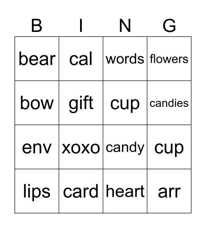 This bingo card has 16 words: card, cup, words, bear, env, cal, candy, heart, bow, gift, lips, flowers, xoxo, candies, cup and arr.