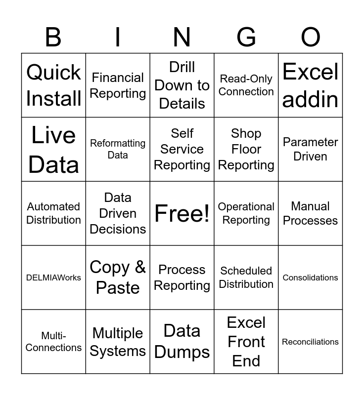 This bingo card has a free space and 25 words: Copy & Paste, Data Dumps, Self Service Reporting, Multi-Connections, Excel addin, Quick Install, Live Data, Financial Reporting, Operational Reporting, Process Reporting, Shop Floor Reporting, Automated Distribution, Scheduled Distribution, Consolidations, Reformatting Data, Lengthy Close, Manual Processes, Drill Down to Details, Parameter Driven, Data Driven Decisions, Reconciliations, Multiple Systems, DELMIAWorks, Read-Only Connection and Excel Front End.