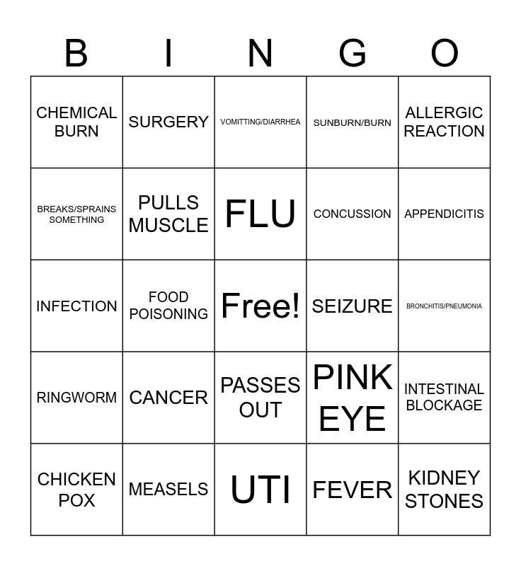 This bingo card has a free space and 24 words: CANCER, MEASELS, FLU, CHICKEN POX, ALLERGIC REACTION, CHEMICAL BURN, BREAKS/SPRAINS SOMETHING, SURGERY, SEIZURE, PASSES OUT, CONCUSSION, INFECTION, PINK EYE, INTESTINAL BLOCKAGE, PULLS MUSCLE, FEVER, BRONCHITIS/PNEUMONIA, VOMITTING/DIARRHEA, APPENDICITIS, FOOD POISONING, KIDNEY STONES, RINGWORM, SUNBURN/BURN and UTI.