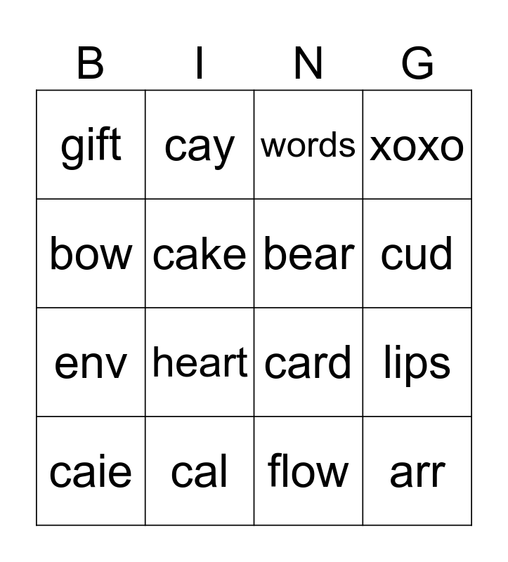 This bingo card has 16 words: cal, lips, words, gift, env, cay, card, flow, bow, cake, caie, xoxo, heart, cud, bear and arr.