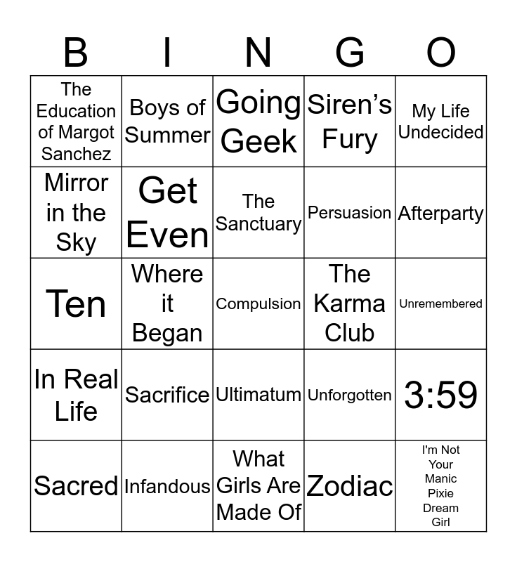 This bingo card has 54 words: Push Girl, In Real Life, Cracked, Empty, Ultimatum, Storm Siren, Siren’s Fury, Siren’s Song, Mirror in the Sky, Library of Fates, The Education of Margot Sanchez, Burning, Infandous, Sacred, Splendor, What Girls Are Made Of, Compulsion, Persuasion, Illusion, Unremembered, Unforgotten, Unchanged, The Karma Club, My Life Undecided, 52 Reasons to Hate My Father, Boys of Summer, A Week of Mondays, In Some Other Life, Tell Me Three Things, Zodiac, Wandering Star, Black Moon, Thirteen Rising, For the Record, Going Geek, Possess, Ten, 3:59, I'm Not Your Manic Pixie Dream Girl, Get Even, Get Dirty, Silver Phoenix, Fury of the Phoenix, Serpentine, Sacrifice, Want, My Kind of Crazy, The Awakened, The Sanctuary, Where it Began, Afterparty, How to Disappear, How to be Brave and The Best Possible Answer.