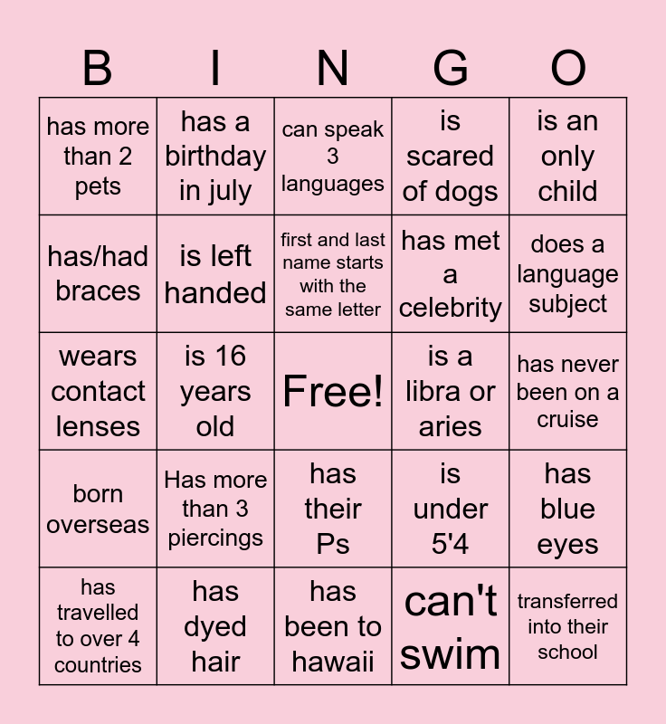 This bingo card has a free space and 24 words: Has more than 3 piercings, has dyed hair, first and last name starts with the same letter, has travelled to over 4 countries, is an only child, has more than 2 pets, has/had braces, has a birthday in july, is a libra or aries, has their Ps, has met a celebrity, wears contact lenses, is under 5'4, has blue eyes, is left handed, can't swim, has never been on a cruise, can speak 3 languages, does a language subject, is 16 years old, transferred into their school, born overseas, is scared of dogs and has been to hawaii.